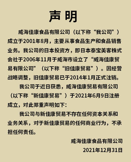 威海佳康食品有限公司位于山東省威海經(jīng)濟(jì)技術(shù)開(kāi)發(fā)區(qū),公司成立于2001年8月1日,由日本泰寶美客株式會(huì)社(Table Mark)投資興建,注冊(cè)資本1220萬(wàn)美元,總投資2000萬(wàn)美元。公司占地面積20000平方米,現(xiàn)有員工240余人。